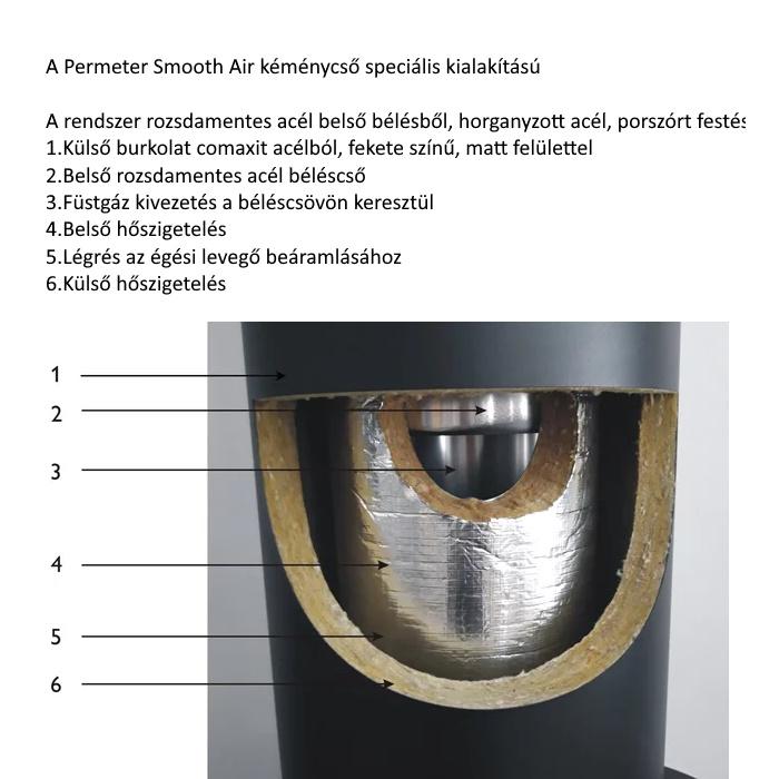A Permeter Smooth Air a biztonság őre: ez a kémény a speciális kialakításával az égési levegőt is biztosítja! Háromhéjú, szerelt fémkémény rendszer, fekete színű, rejtett csőkapcsolatos külső csővel. Hasábfával üzemelő kandallókhoz alkalmas. Nincs szükség alapozásra a szereléshez, gyors és egyszerű a telepítése. A Permeter Smooth Air kéményrendszert a SIRIUS, a SARGAS és a MIMAS kandallókhoz ajánljuk. Függőleges kéményként szerelhető konzolos vagy talpas indítással vagy közvetlenül a Schiedel kandallóról indítható.